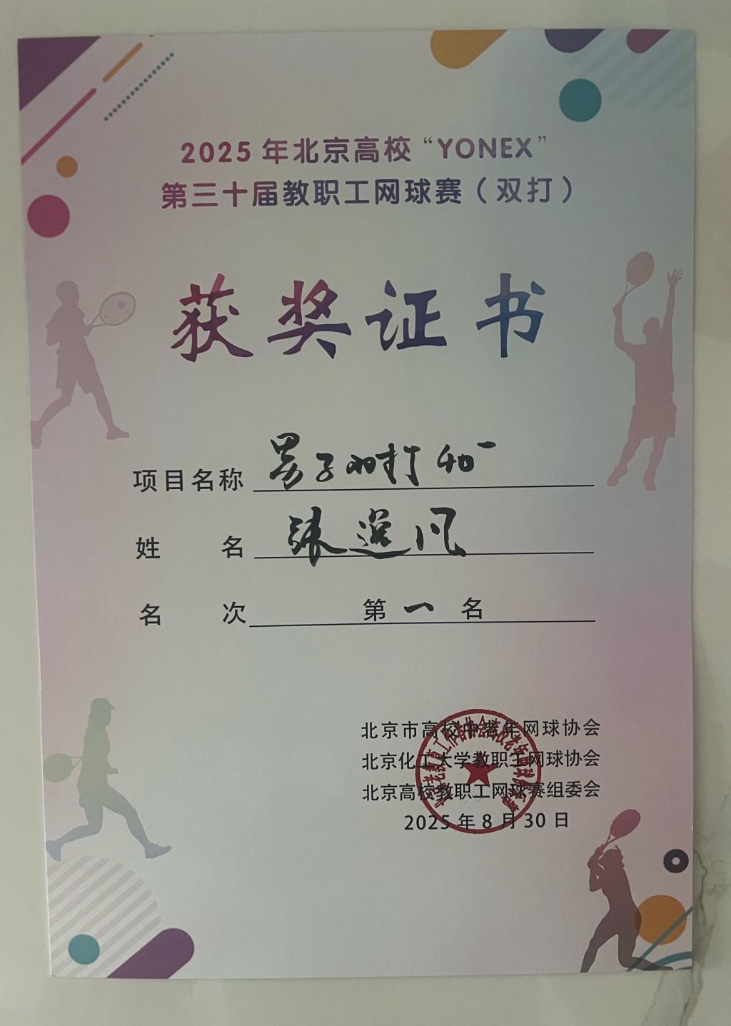 近日,第9届北京市教师网球赛与第30届北京市高校教职工网球赛相继落幕。其中,北京市教师网球赛由北京市体育局、北京市网球运动管理中心主办,于9月6日在朝阳体育中心开赛,今年首次融合了北京市中小学于高校教师同场竞技,来自中国人民大学附属中学、北京师范大学附属实验中学和各大高校近200名教师运动员。我院教师张逸凡首次参加此赛,与搭档默契配合,连胜6场,夺得40岁以下组混合双打冠军。
