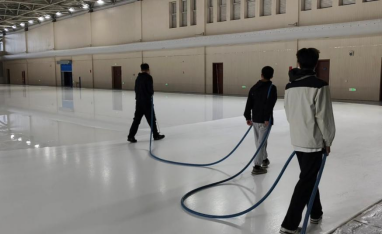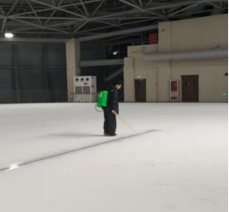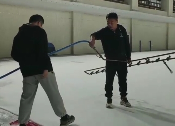 在冰场一角,喷白用的背负式喷雾器、浇水用的专用水管已整齐摆放。队员胡旻熙率先尝试喷白操作,却因力度不均导致冰面出现“厚喷结块”与“漏喷空白”,师傅示范:“手臂打直、匀速走步,就像给冰面‘涂匀粉底’,一点偏差都会影响后续划线。”简单复盘后,队员们分组协作,一人操作、一人在旁提醒节奏,半小时后,原本斑驳的冰面终于实现均匀覆盖。初次实操让大家深刻意识到:制冰不仅是体力活,更是对细节的极致较真。